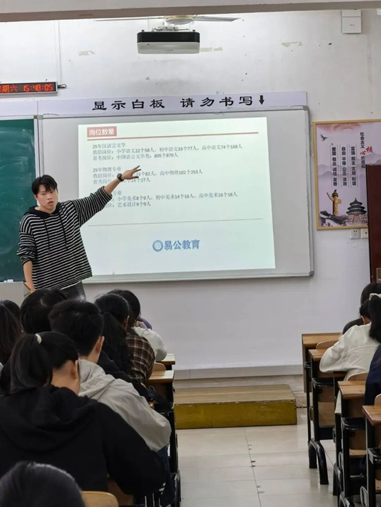 为帮助2026届毕业生明晰职业规划,把握就业先机,11月4日,文学与新闻传播学院(师范教育学院)于主教楼N107举办考公考编主题讲座。讲座特邀易公教育讲师主讲,现场气氛热烈。