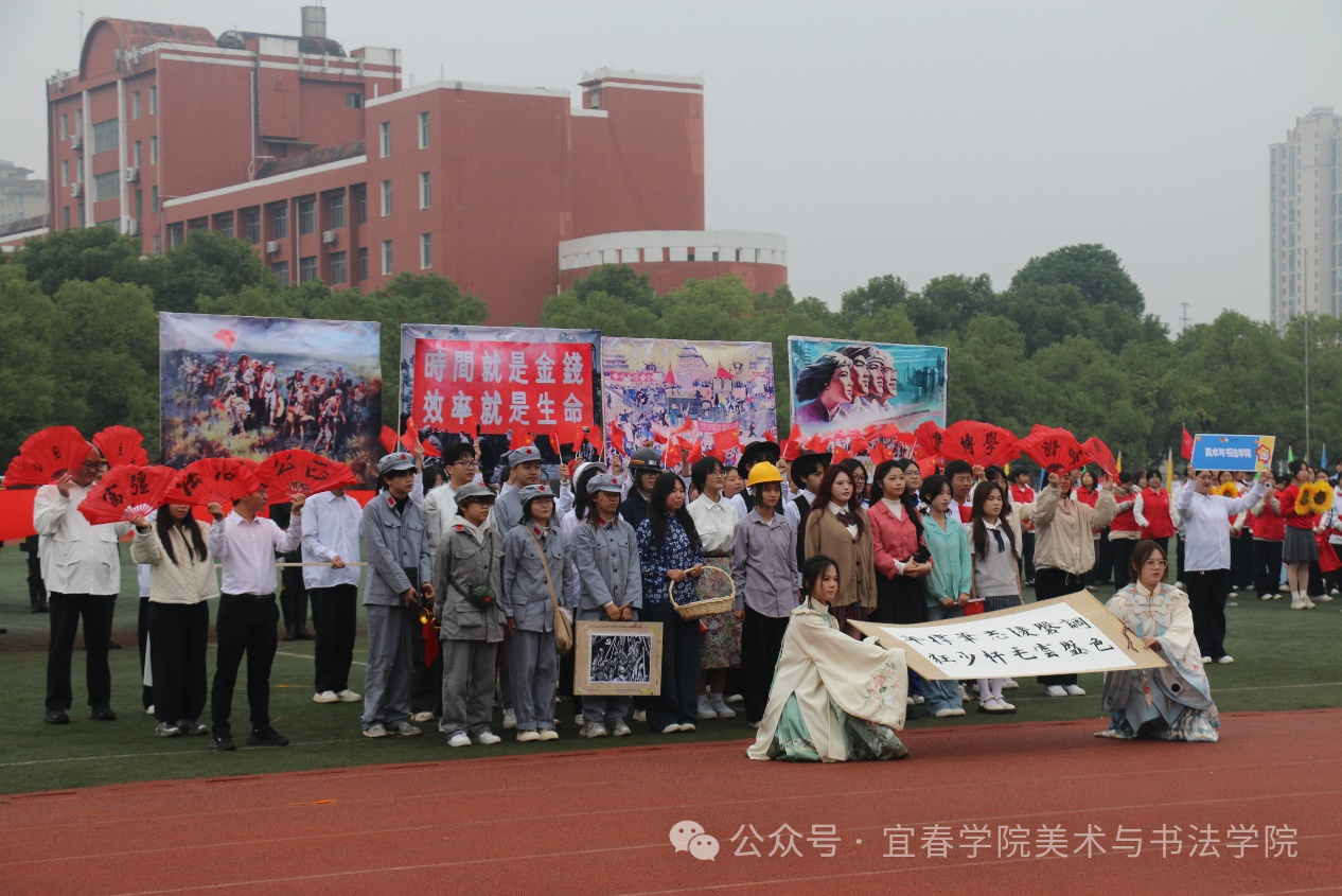 2025年11月5日,宜春学院运动会在宜春学院学府校区田径场盛大开幕。美术与书法学院方阵以极具艺术感的“艺绘山河”节目惊艳亮相,成为开幕仪式的一大亮点。方阵队员们身着统一服饰,步伐整齐划一,在行进过程中通过精心编排的动作与道具,千里江山图的壮美画卷生动呈现,赢得全场观众的阵阵欢呼与掌声。随着一排礼炮齐放,绚丽的彩烟在空中绽放,运动会正式拉开帷幕。