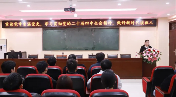 11月11日中午,院党委书记龙玲作“学习贯彻党的二十大精神,重温党章党史,争做新时代接班人”专题辅导。她结合党的百年奋斗历程与习近平新时代中国特色社会主义思想的核心要义,紧密联系学员学习生活实际,深入解读二十届四中全会提出的“以中国式现代化全面推进中华民族伟大复兴”等重要部署,并勉励学员将党章要求与党史精神内化为价值追求、外化为实际行动,推动理论学习入脑入心、见行见效。