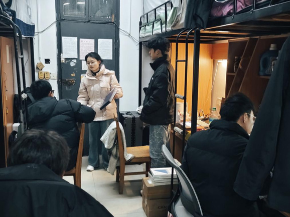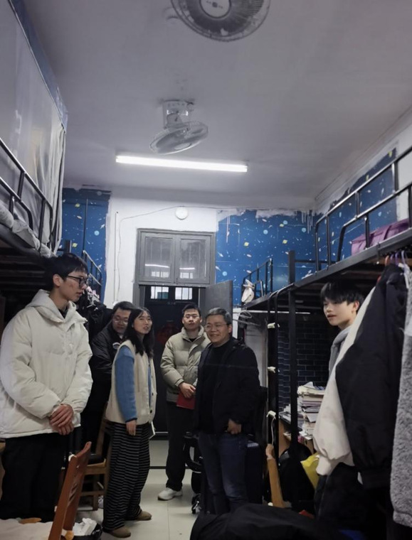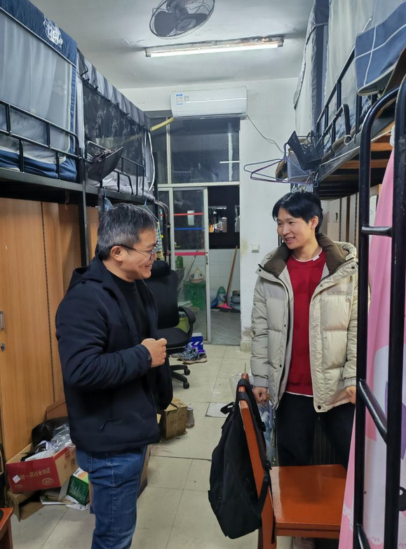 走访过程中,苏文火副院长一行走进各年级学生寝室,与已返校学生亲切交谈:“返校途中还顺利吗?”“新学期有什么计划?”每到一处,领导老师们都仔细询问同学们的假期生活、返校适应情况及新学期的学习规划,耐心倾听同学们在学习和生活中遇到的困难与需求。他鼓励同学们尽快调整状态,从假期模式切换到学习模式,以饱满的精神面貌迎接新学期的挑战,同时叮嘱大家要珍惜大学时光,室友之间要互相关心、共同进步,营造积极健康的宿舍文化氛围。