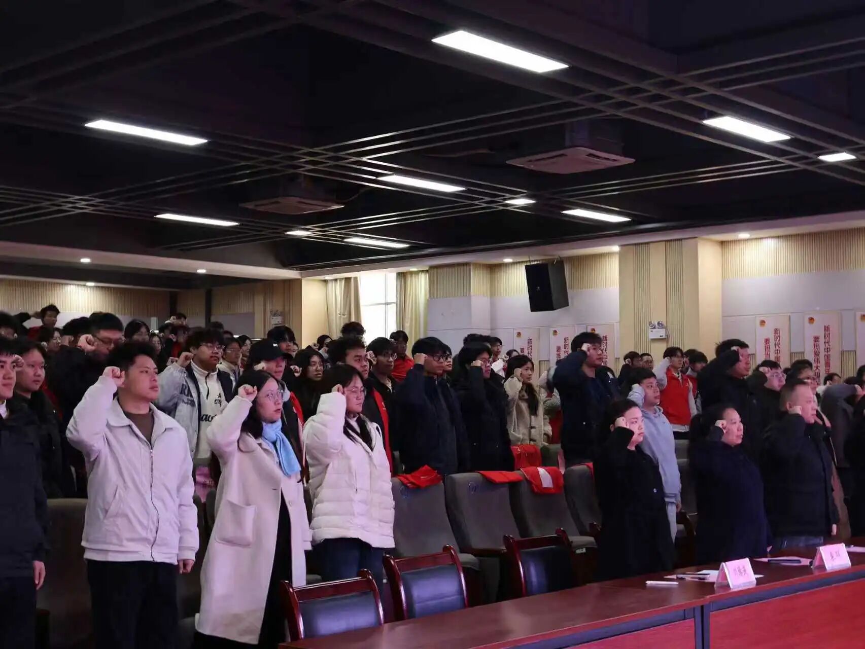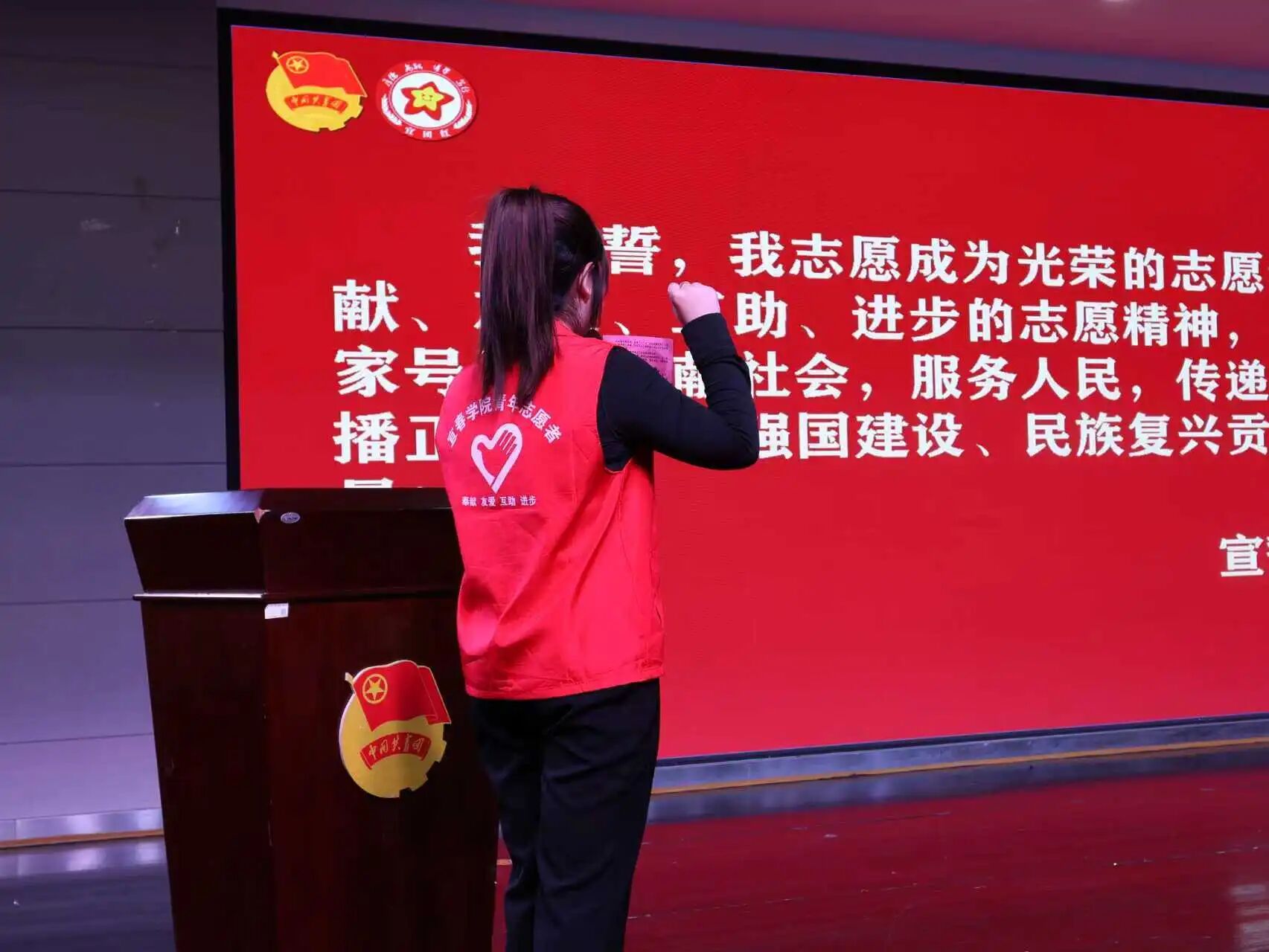 仪式现场,全体志愿者紧握右拳庄严宣誓。紧握的右拳,坚定的目光,铿锵的誓言。这一刻,青春与奉献紧紧相连,他们用最炽热的方式,许下对雷锋精神的传承之约。