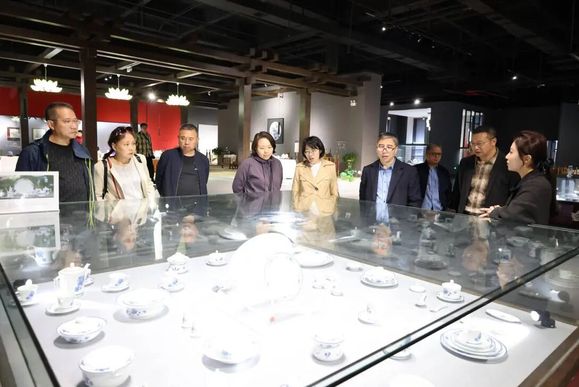 交流伊始,在范玉群总监的引导下,高建青一行先后参观了国瓷红叶展品展厅,近距离领略国瓷的匠心魅力与文化底蕴。展厅内,涵盖国宴用瓷、艺术陈设瓷、文创产品等多个品类的展品琳琅满目,其器型规整、瓷质细腻、釉面莹亮,充分展现了国瓷红叶作为“现代官窑”的精湛工艺与品牌实力——作为景德镇陶瓷集团核心子品牌,国瓷红叶传承千年窑火,坚守品质初心,先后为人民大会堂、重大庆典活动等提供专用瓷,是国内日用陶瓷领域的标杆企业,承载着用陶瓷讲好中国故事的使命担当。